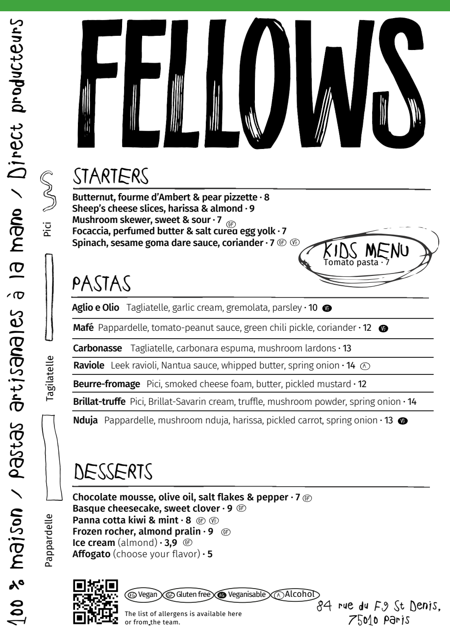 At Fellows, everything is made-in-house. Fresh pasta is handmade daily by our team. We work with the best artisans and producers, favouring direct sourcing, local partners, regenerative and organic farming, and we only use seasonal ingredients.