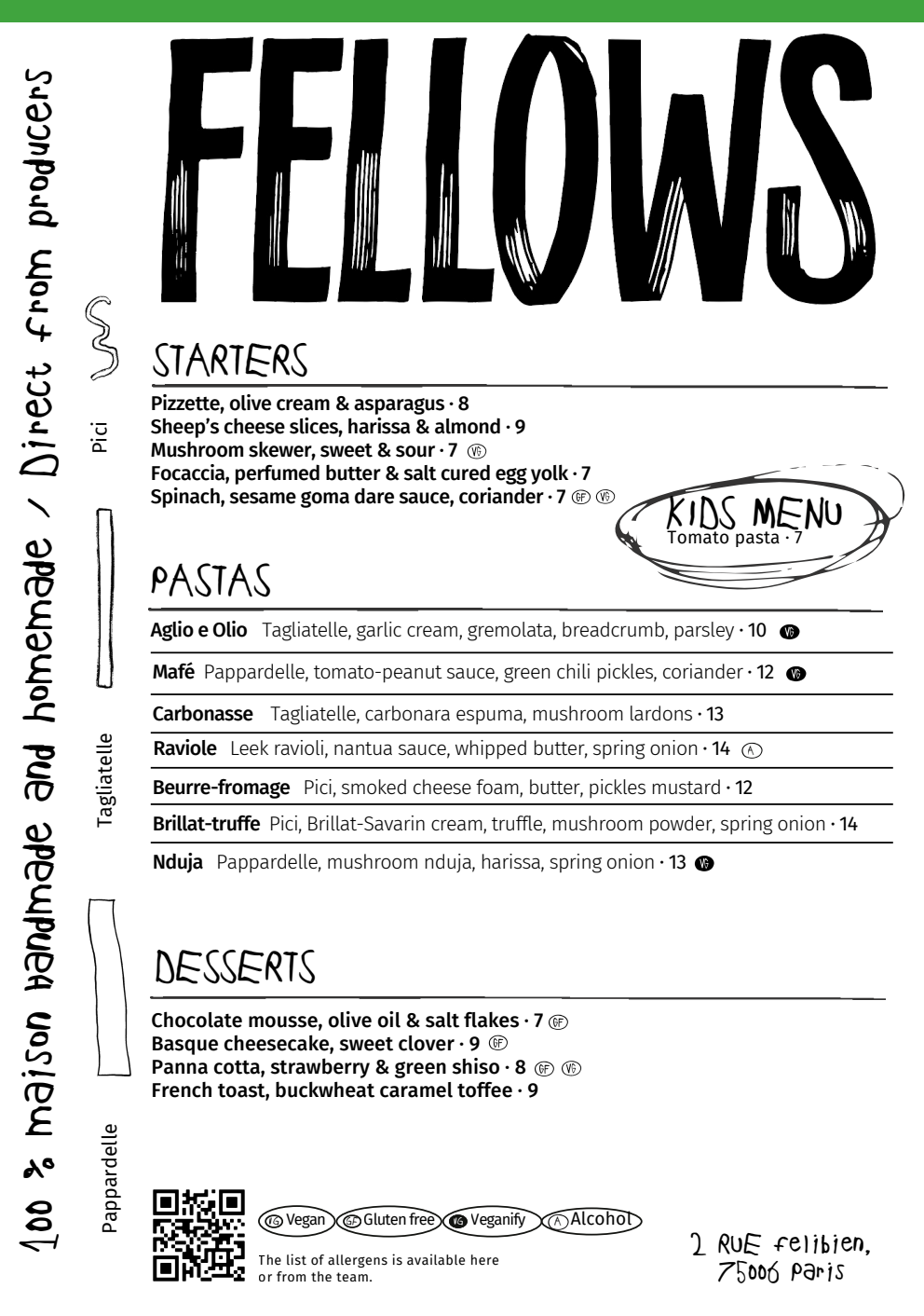 At Fellows, everything is made-in-house. Fresh pasta is handmade daily by our team. We work with the best artisans and producers, favouring direct sourcing, local partners, regenerative and organic farming, and we only use seasonal ingredients.